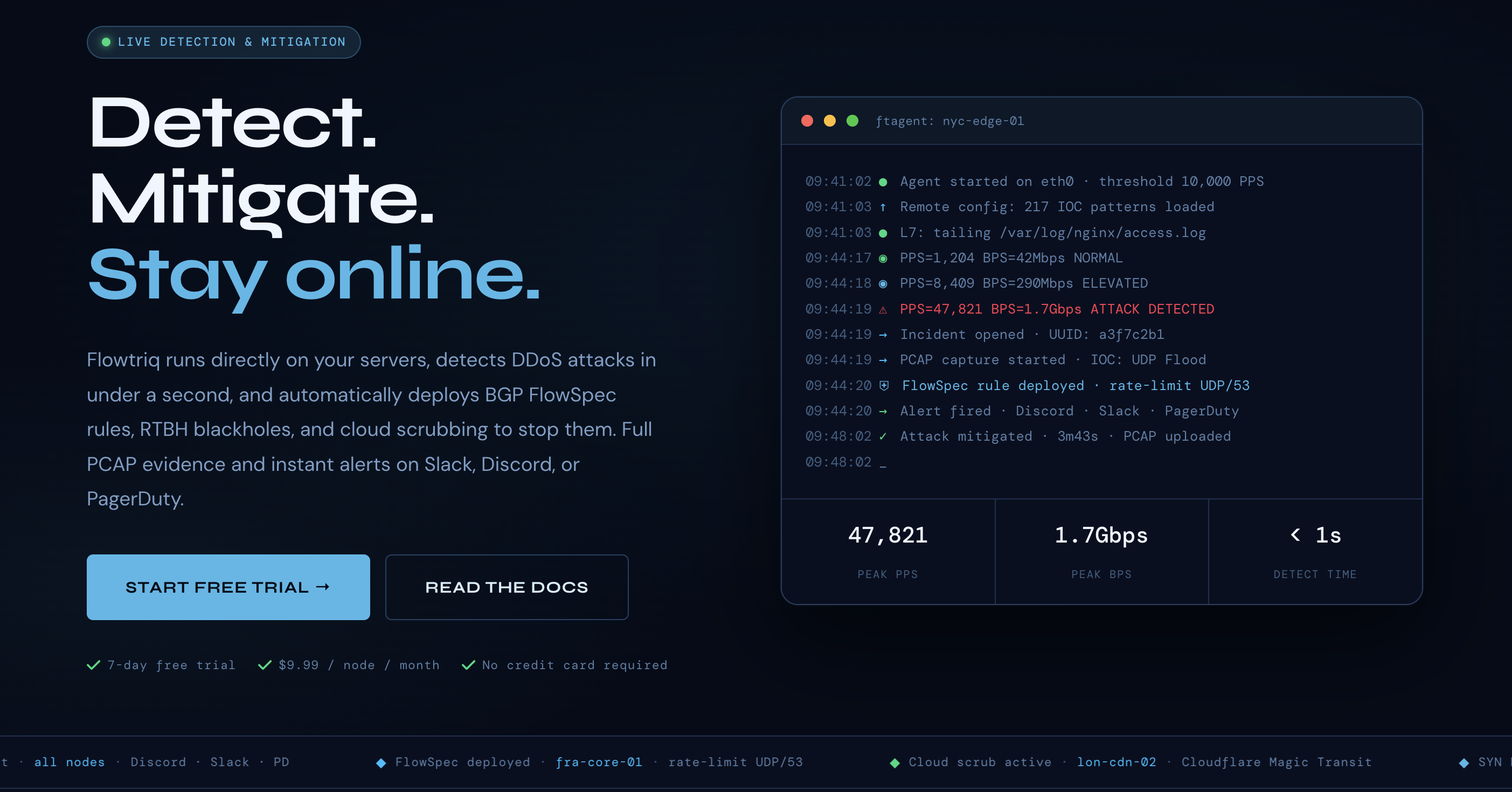 Most security platforms claim to protect your infrastructure, but in reality, they just bury you in "low-priority" alerts while your latency spikes. At The SaaS Desk, we’ve debated this extensively: most DDoS mitigation is reactive, expensive, and surprisingly slow. Flowtriq flips the script by proving that sub-second mitigation doesn't require a million-dollar appliance or a massive SOC team. While our team was skeptical about a Python-based agent (ftagent) handling high-throughput packet analysis, our collective testing revealed a lean, mean architecture designed for the edge. It’s a lightweight, agent-based platform that brings enterprise-grade BGP FlowSpec and RTBH (Remote Triggered Black Hole) capabilities to any Linux server in under two minutes, focusing on immediate packet-level visibility rather than post-incident "learning."